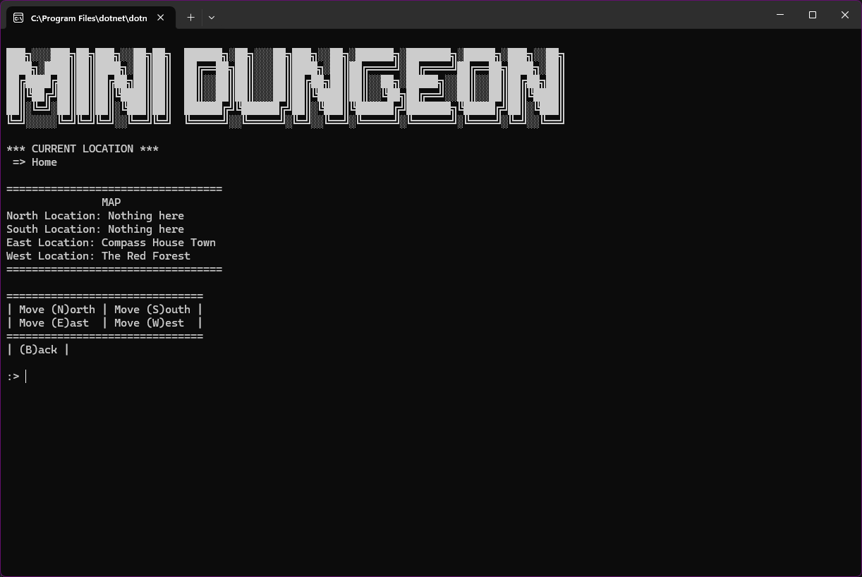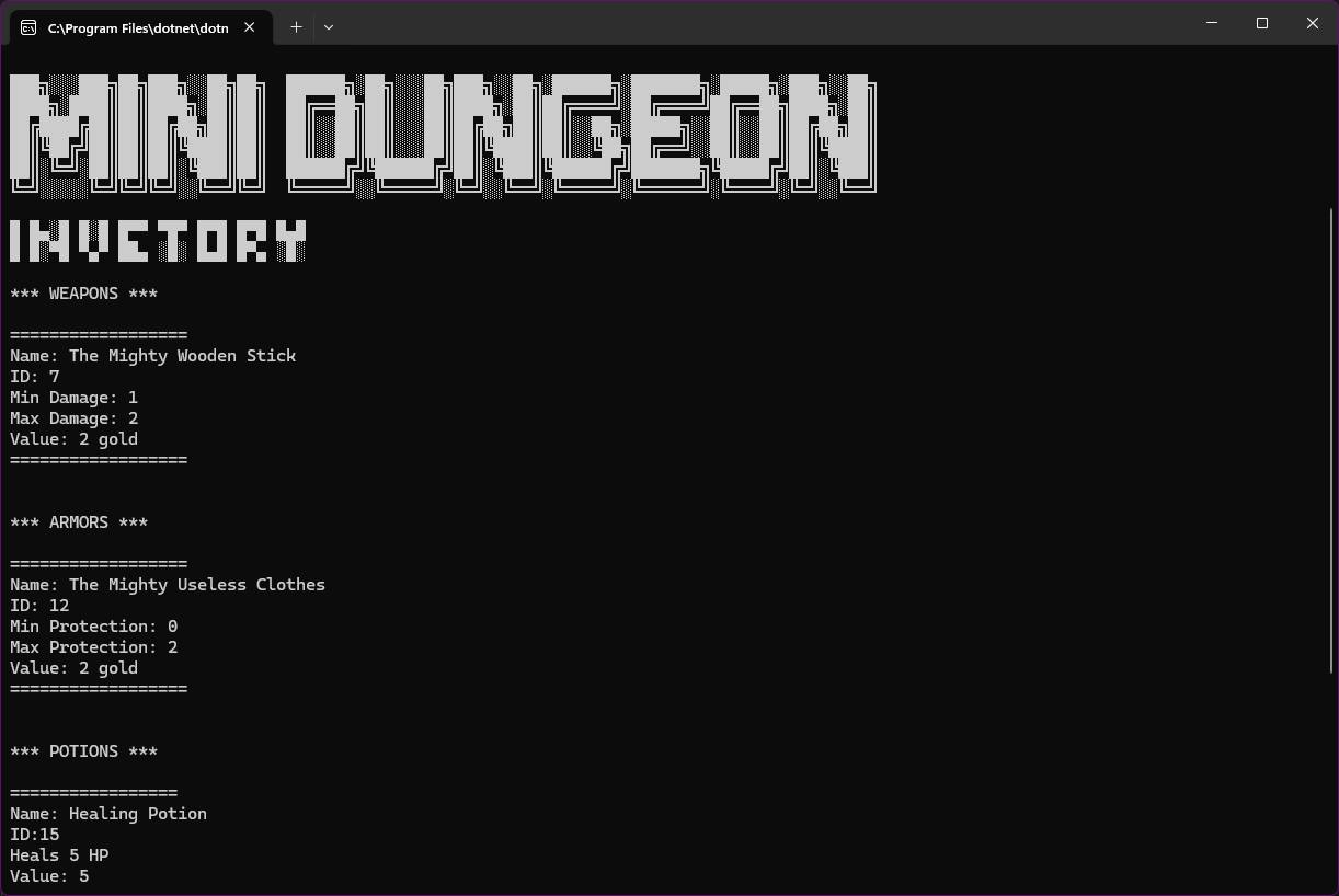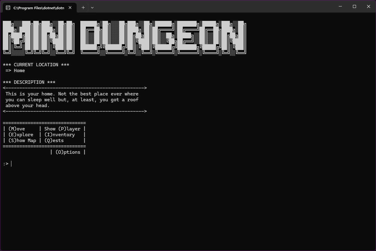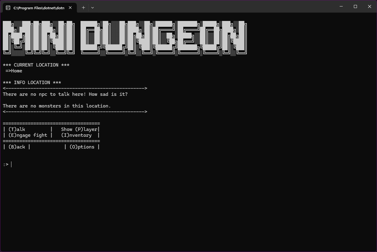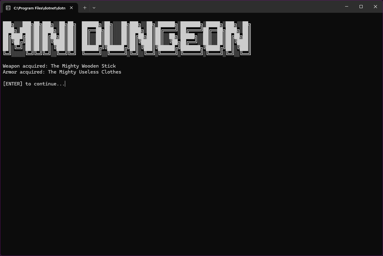 Mini Dungeon is a text-based RPG built as a C# console application, inspired by traditional dungeon crawler games. This project demonstrates my programming fundamentals, object-oriented design principles, and ability to create engaging gameplay mechanics through code alone.