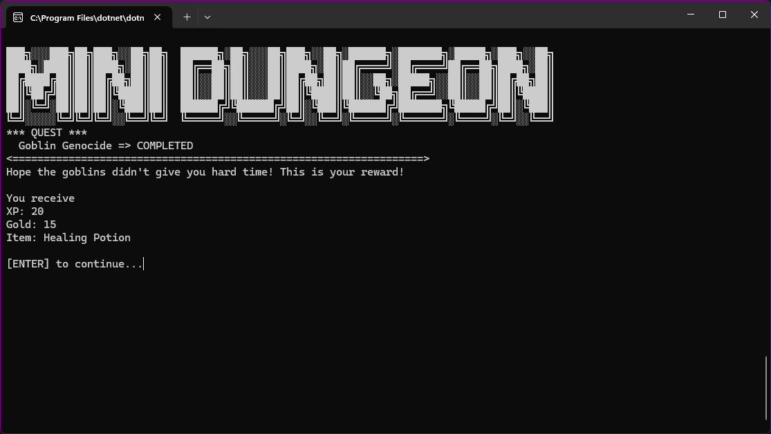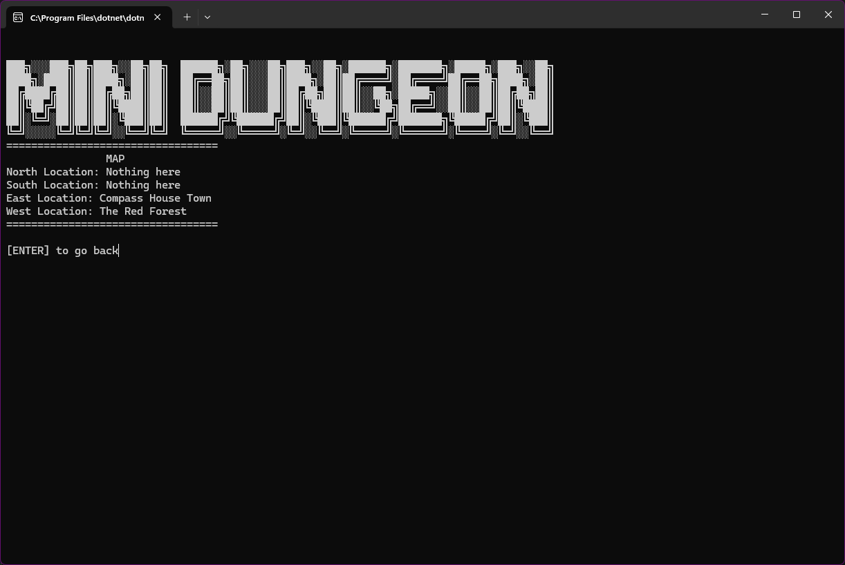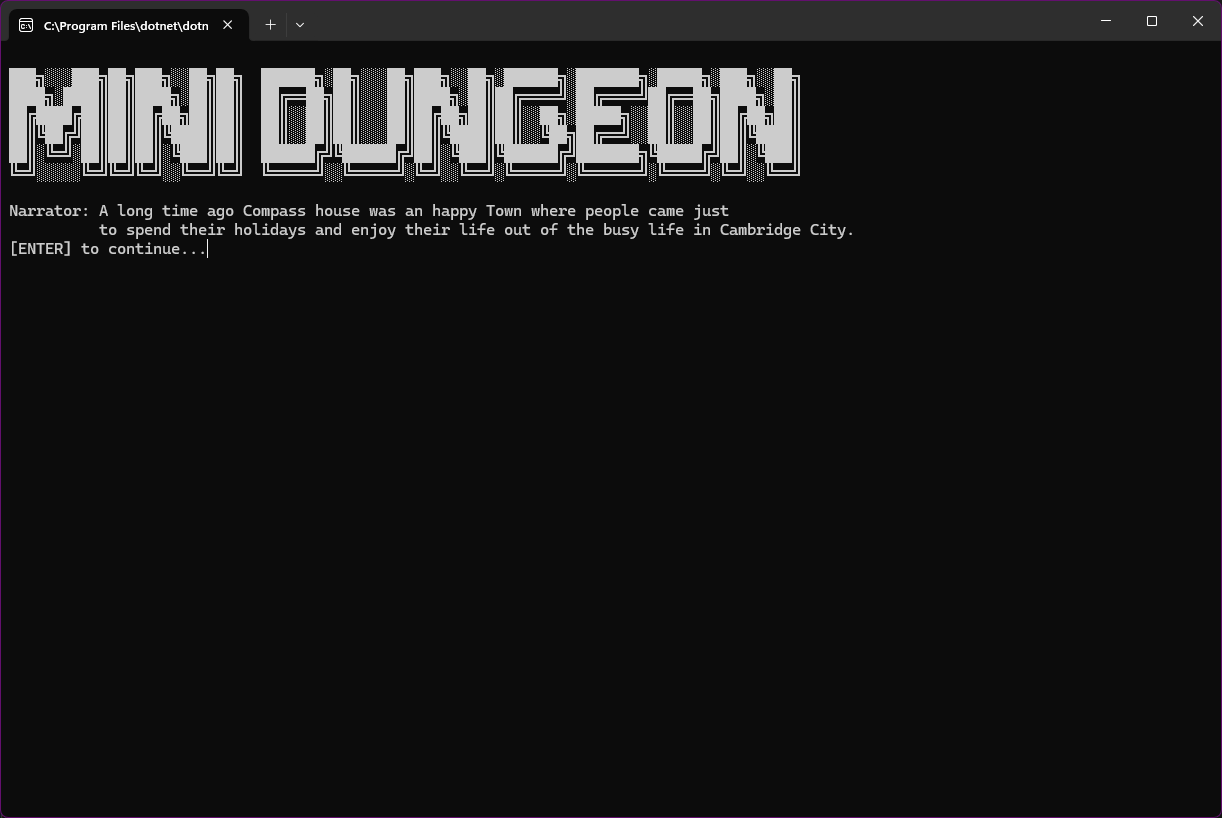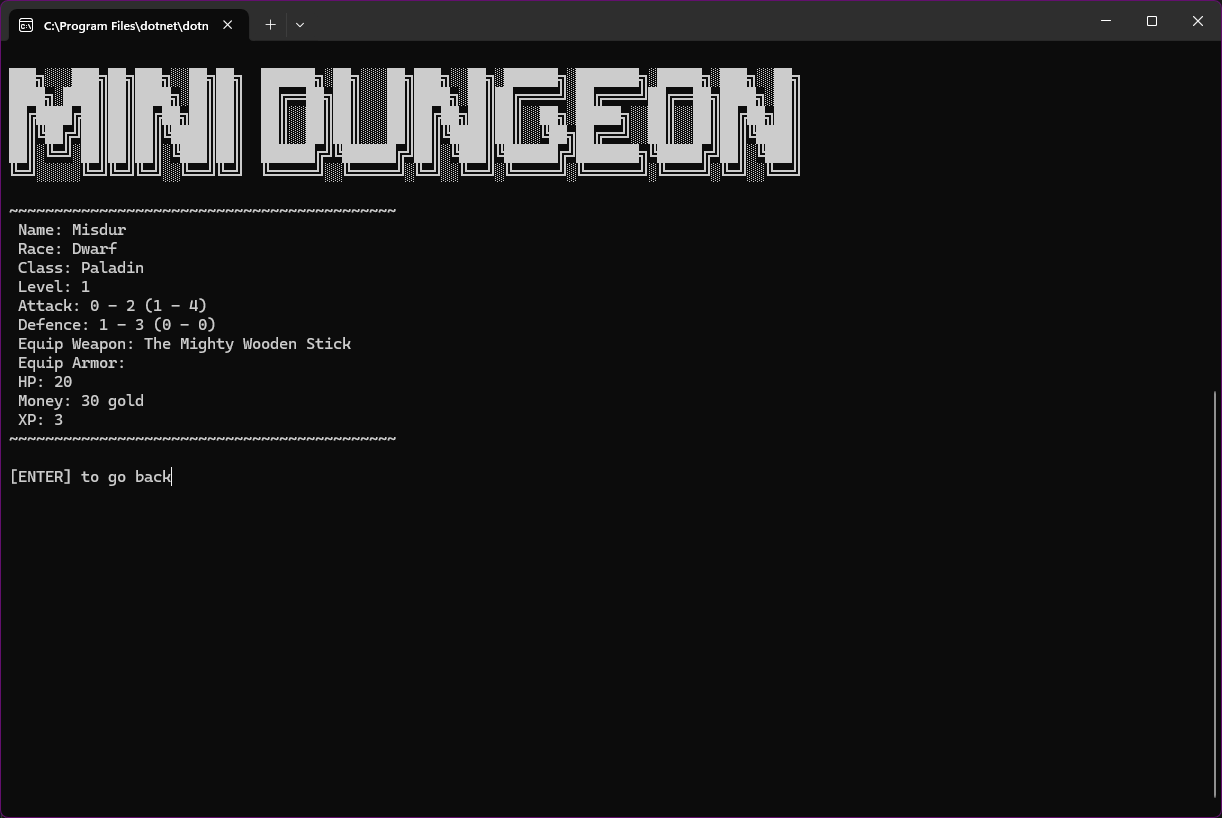 Mini Dungeon is a text-based RPG built as a C# console application, inspired by traditional dungeon crawler games. This project demonstrates my programming fundamentals, object-oriented design principles, and ability to create engaging gameplay mechanics through code alone.