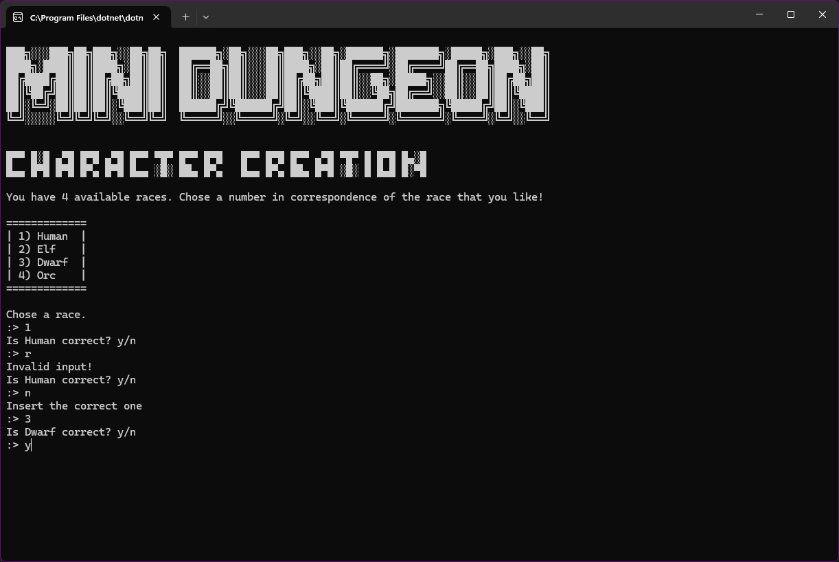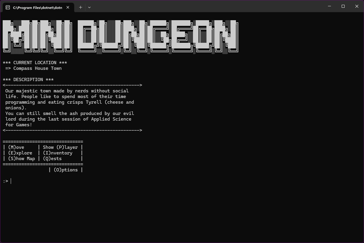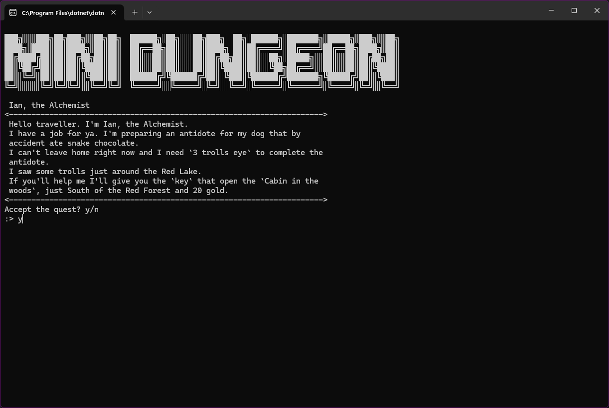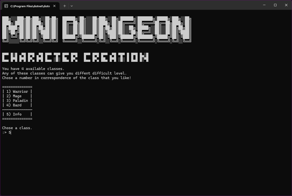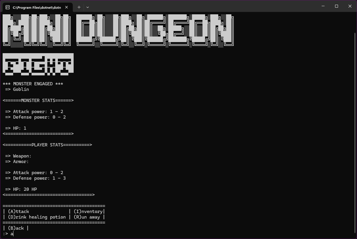 Mini Dungeon is a text-based RPG built as a C# console application, inspired by traditional dungeon crawler games. This project demonstrates my programming fundamentals, object-oriented design principles, and ability to create engaging gameplay mechanics through code alone.