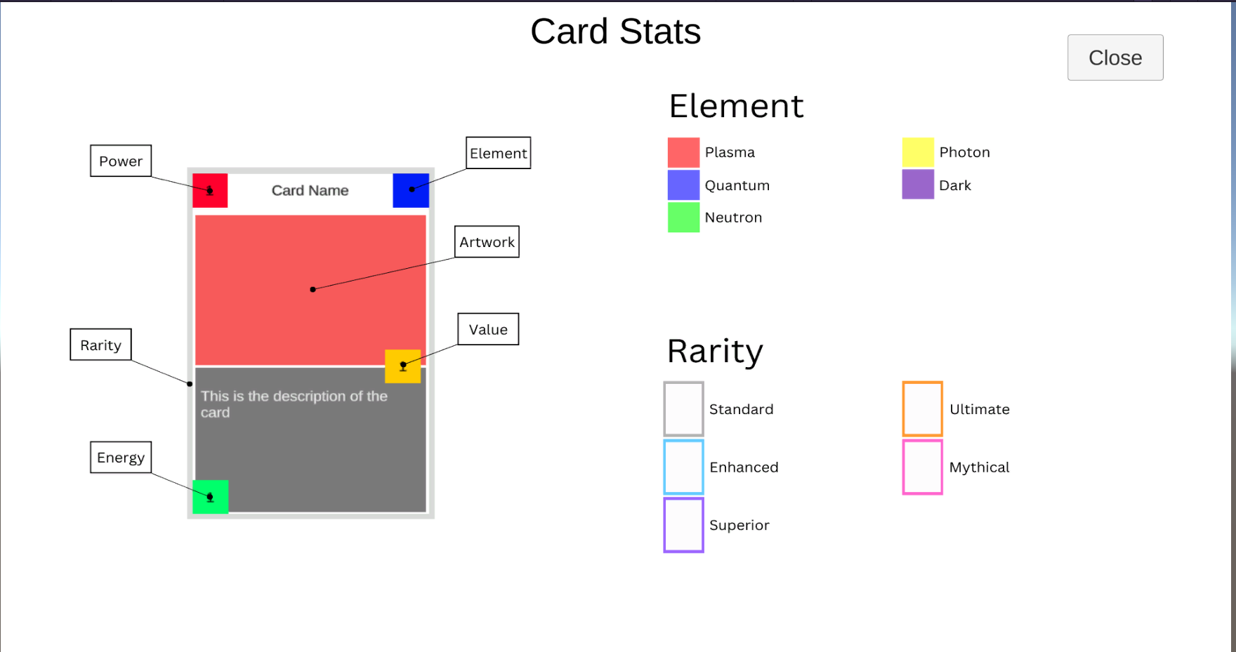 - Procedurally Generated Cards: Each card features unique combinations of elements and stats