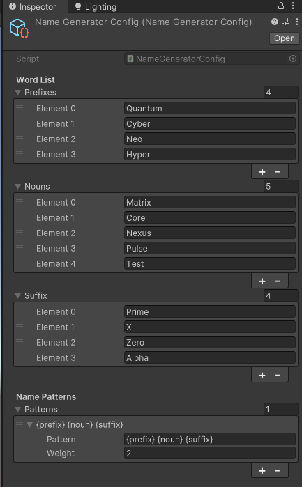 Solution: Developed a pattern-based generation system with weighted randomization. Separated word lists into prefixes, cores, and suffixes, allowing for controlled variety while maintaining coherent naming conventions.